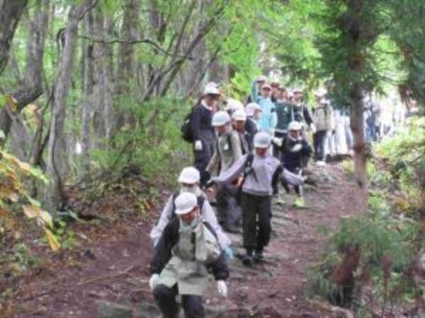 舘岩自然の教室2日目はメインイベントとなる、前山登山。朝まで雨が降っていましたが、登山するためにみんなが集合するとなんと雨がやみ、頂上に着くころにはなんと晴れて、頂上からの景色がとてもきれいでした。