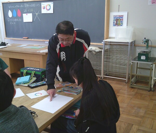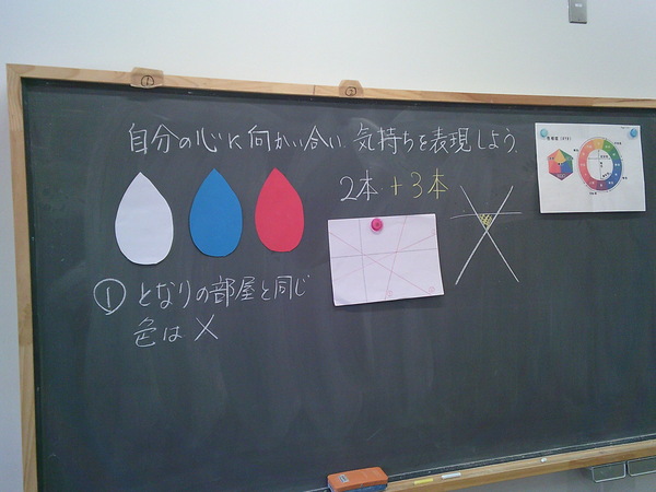 校長先生が6年生へ特別授業をしてくれています。「自分の心に向かい合い、気持ちを表現しよう」という表題で図工の授業を行っています。画用紙に決められた本数の線を引き、色を付けていくことで自分の気持ちを表現しようとみんな真剣に取り組んでいました。