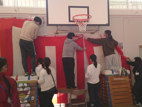 3月11日(水)の放課後、先生方で体育館に紅白幕を設置しました。6年生の卒業式に向けて、先生方の思いを込めながら一つ一つ丁寧に張りました。